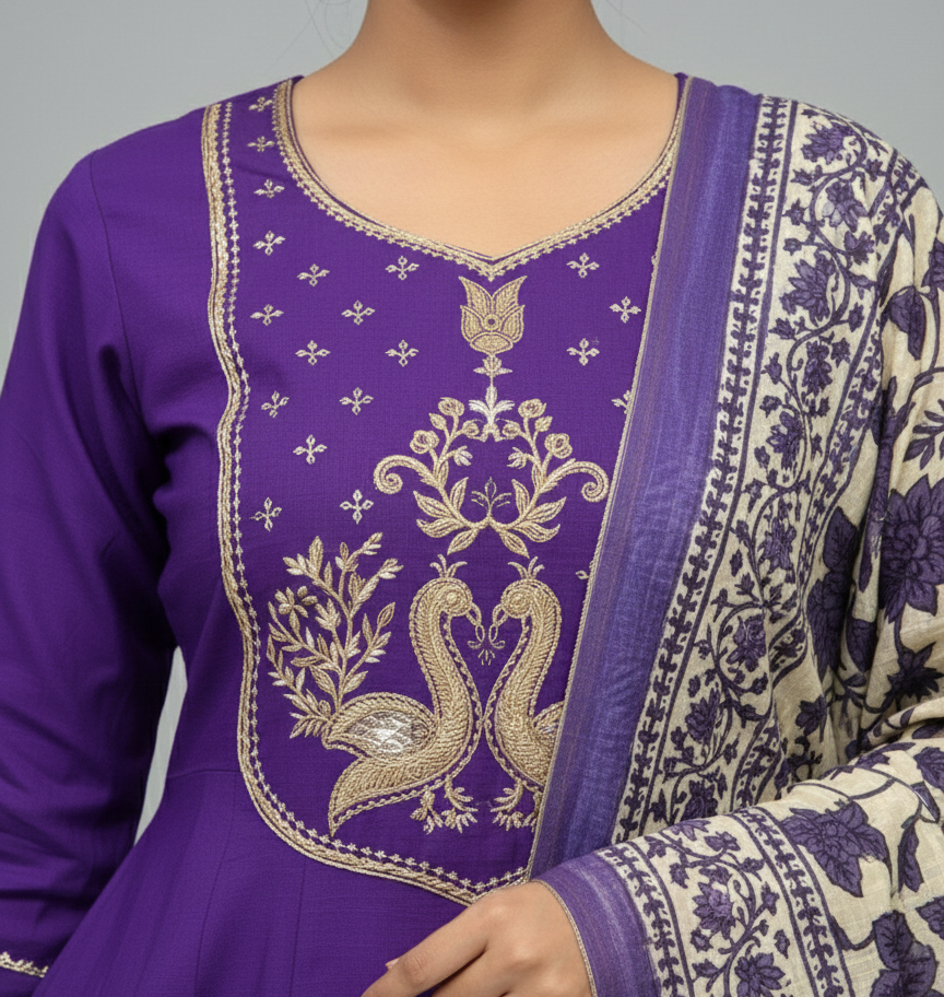 Pattern: Solid with Embroidered Yoke (Gold Zari and Sequin work featuring bird and floral motifs)